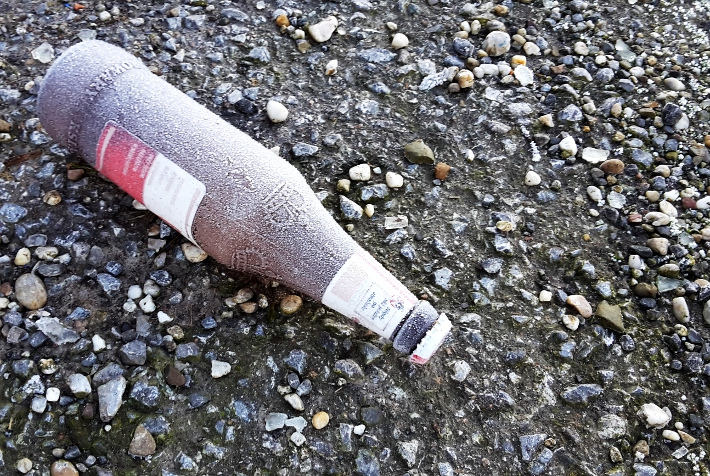 Wohl ein norwegischer LKW-Fahrer hat eine Flasche Bier verloren – hier, wo das Schlafen im Übrigen per Verkehrsschild offiziell verboten ist! Ideale Voraussetzungen für einen guten Rutsch ins neue Jahr 2017…